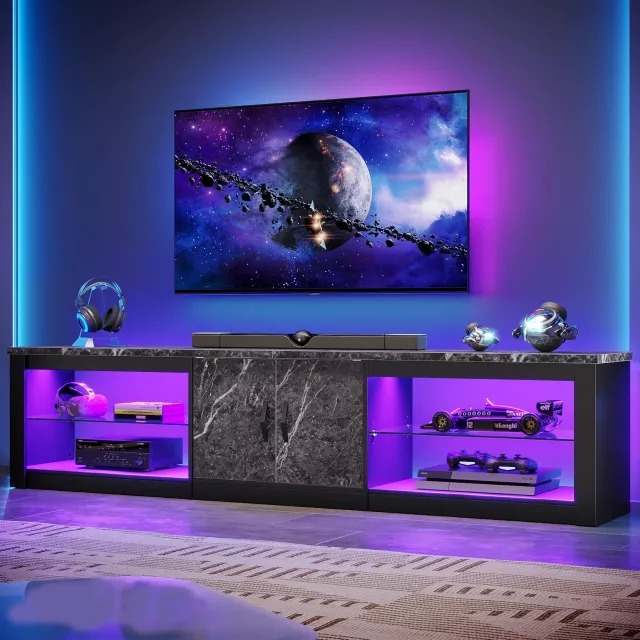 This TV stand is not just a piece of furniture; it’s an essential part of your home entertainment system. Whether you’re hosting a movie night with friends, playing your favorite video games, or simply relaxing in front of the TV, this stand enhances the experience with its sleek design and practical features. The customizable LED lighting adds a touch of personalization, making it easy to match your mood or the theme of your space. With its durable construction, spacious design, and organized cable management, this entertainment center is built to last and designed to impress.