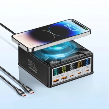 260W GaN Fast Charger with Digital Display – 6-in-1 USB-C & Wireless Charging Station