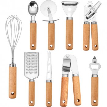 Stainless Steel Kitchen Gadget Set with Wooden Handles & Pizza Cutter