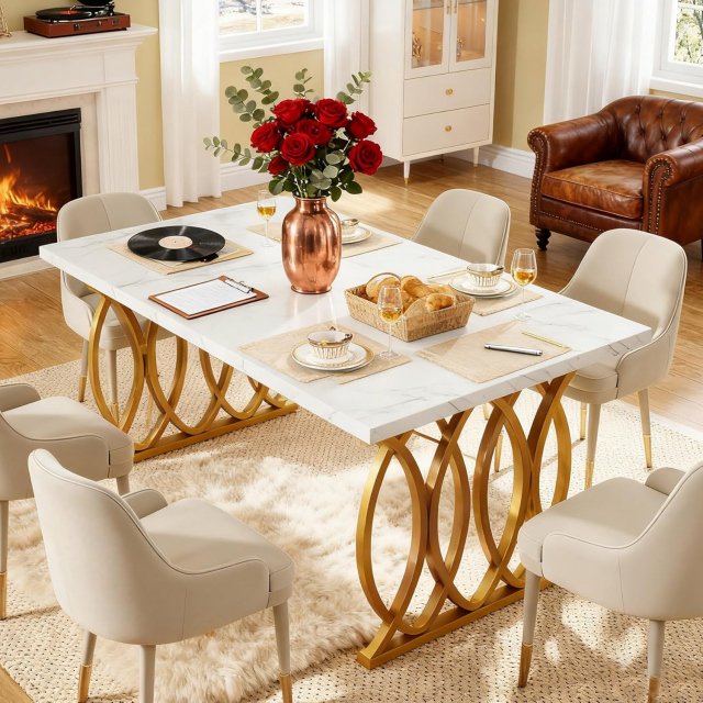 This dining table is more than just a piece of furniture; it’s a statement of style and practicality. Whether you’re enjoying a family meal or hosting a special occasion, its spacious surface ensures that everyone has room to dine comfortably. The sleek white marble-like tabletop is easy to clean, making it perfect for both everyday use and more formal gatherings.