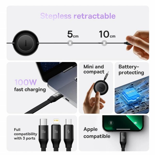 Meet the charging cable designed to simplify your everyday life. This retractable 3-in-1 fast charging cable lets you power up your phone, tablet, and laptop at the same time—without tangled wires or slow charging. Pull it out from both ends, adjust it to any length you need, and retract it back smoothly when you’re done. Clean, compact, and incredibly practical.