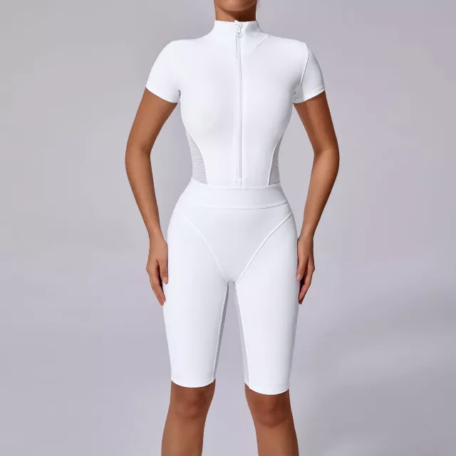 This fitted workout jumpsuit features a convenient front zipper for easy wear and adjustable coverage. The short sleeves offer a balanced feel—keeping you cool during intense sessions while providing light coverage for everyday workouts. The breathable, quick-dry fabric pulls moisture away from your skin, helping you stay dry and comfortable whether you’re flowing through yoga poses or pushing through a high-energy workout.